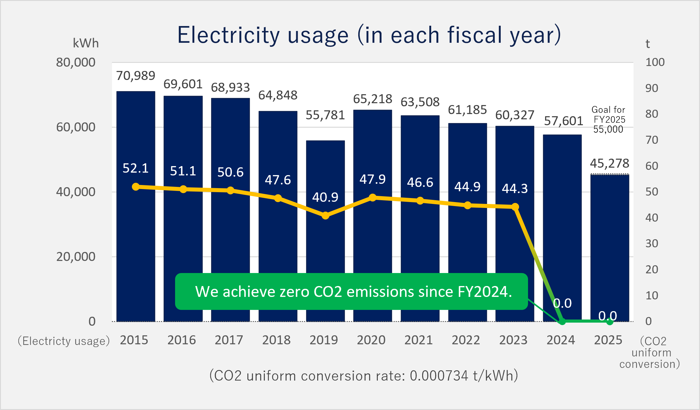 We have introduced 100% renewable energy to all our electricity use that achieves zero CO2 emissions.